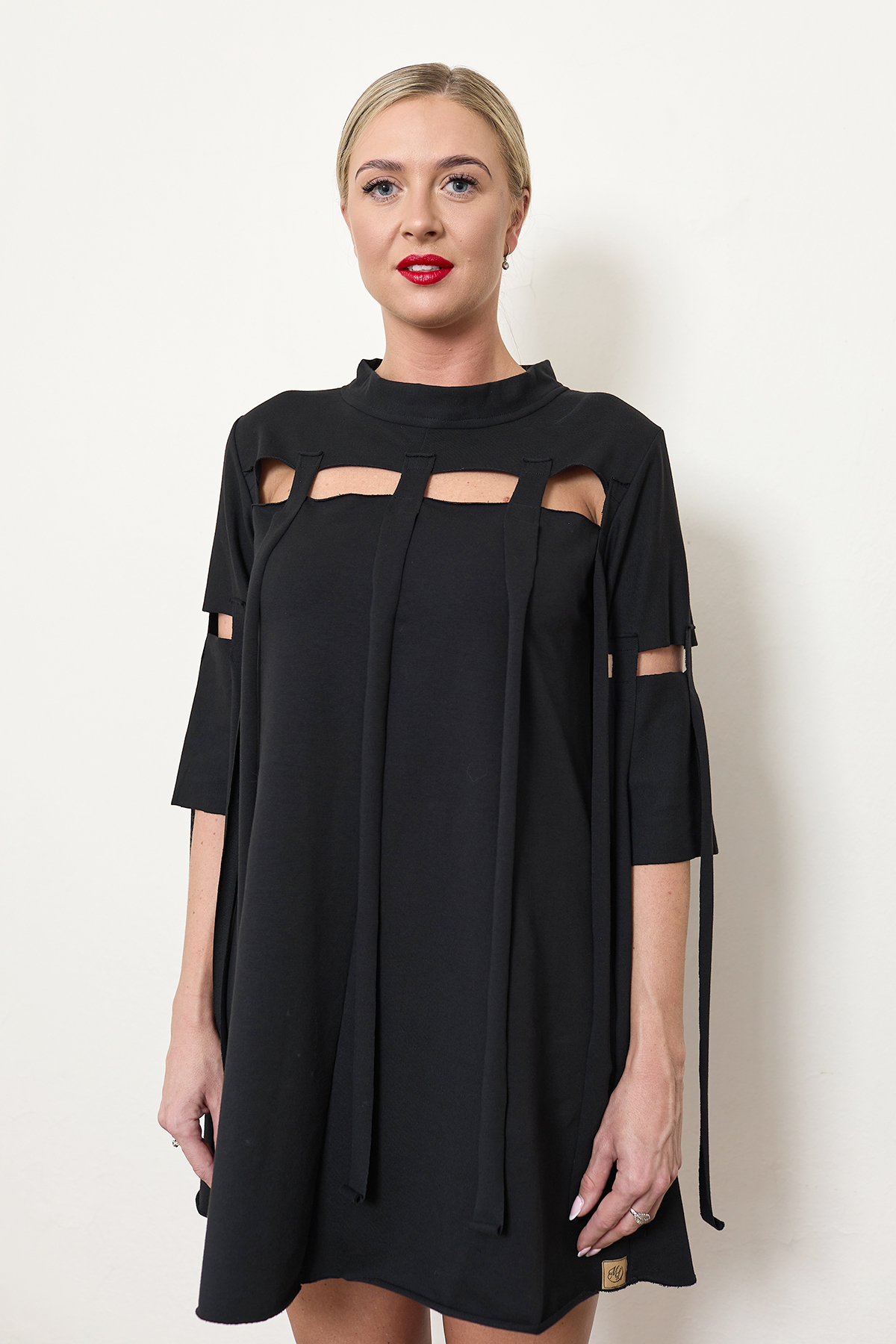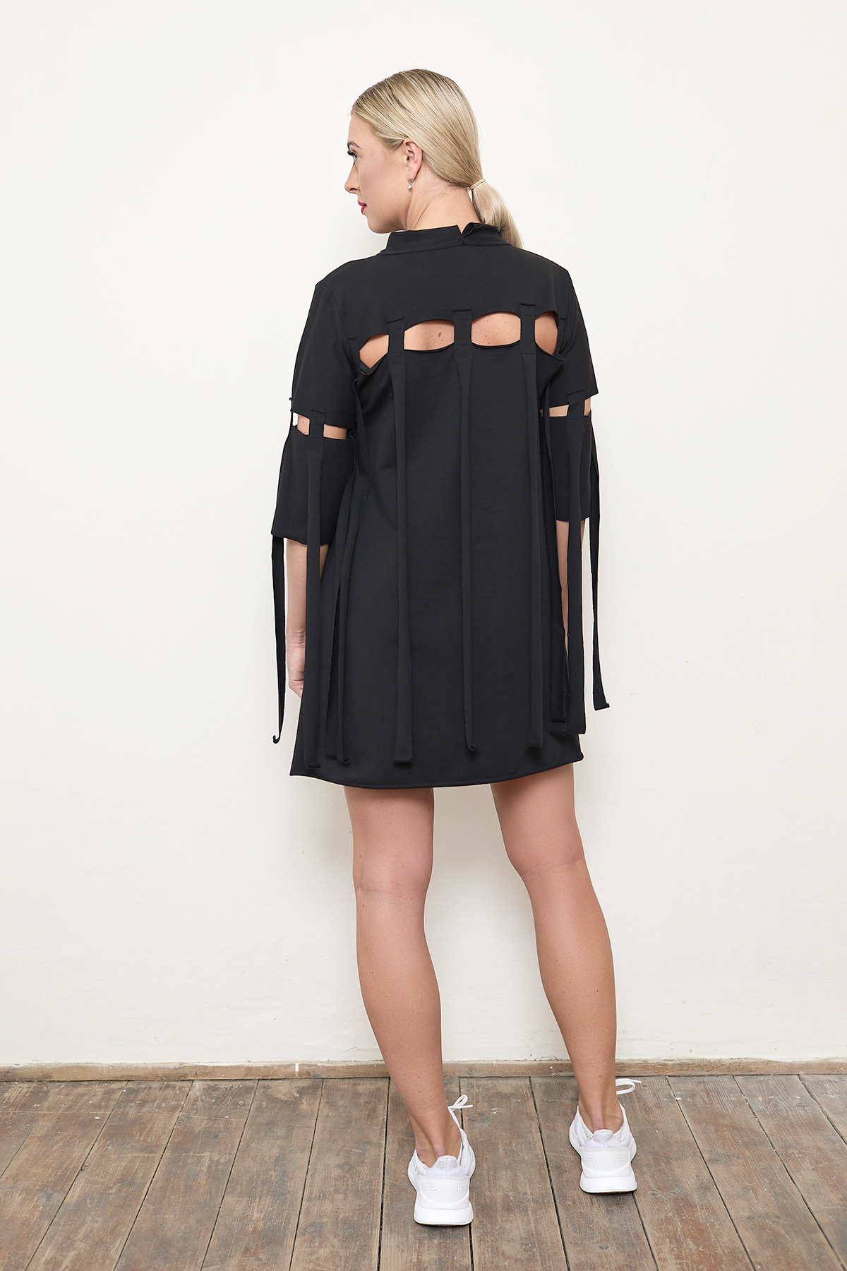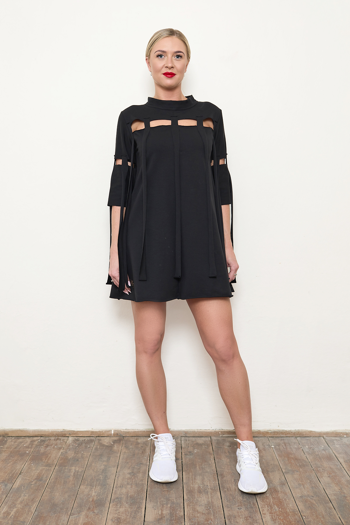Střih šatů: šaty do áčka, s průstřihy v předním, zadním díle i na rukávech. V předním, zadním díle a na rukávech našité třásně široké 2,5 cm.